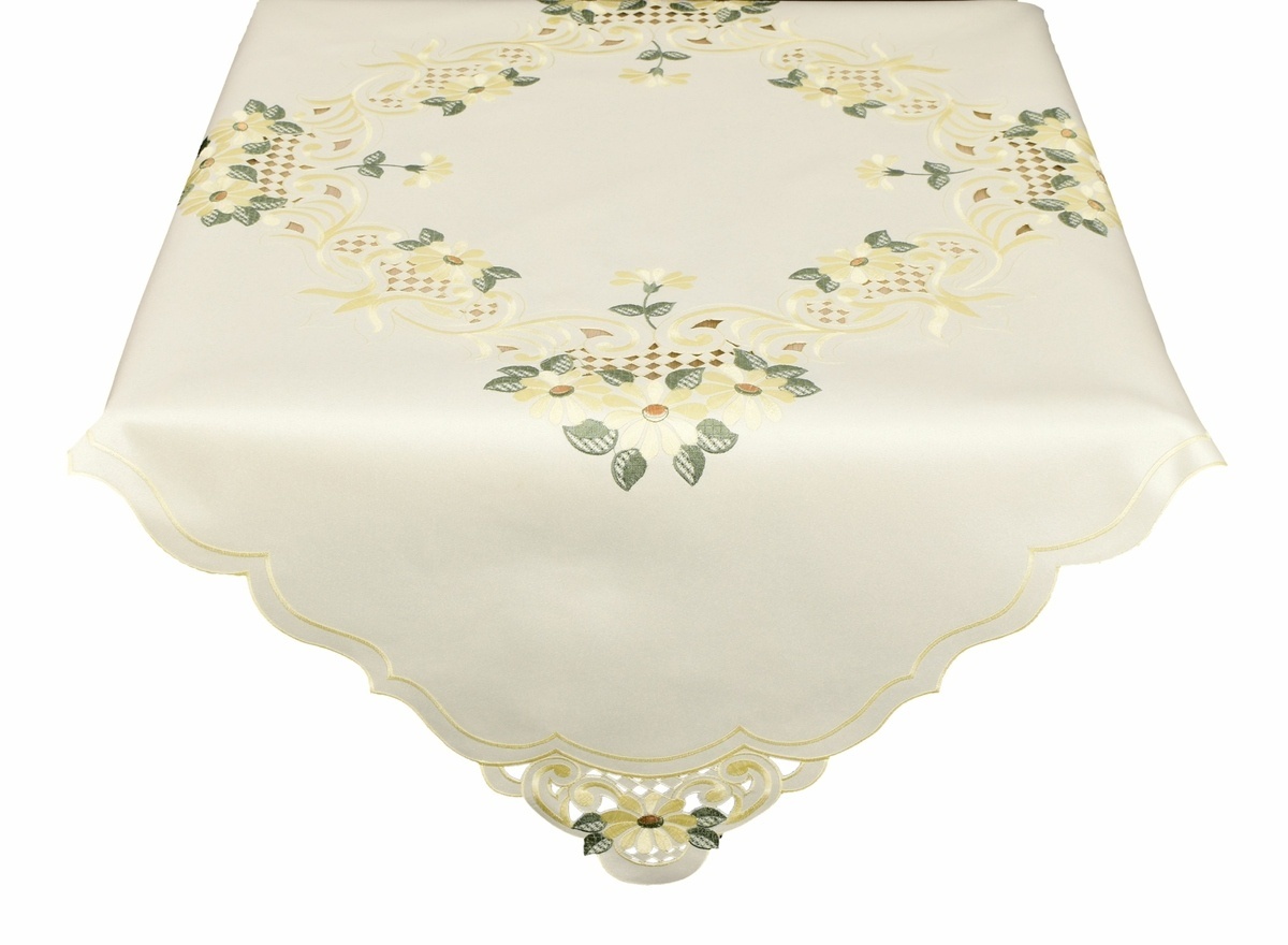 Nádherný vyšívaný ubrus s příjemným decentním ornamentálním vzorem dokonale působí na prostřeném stole.