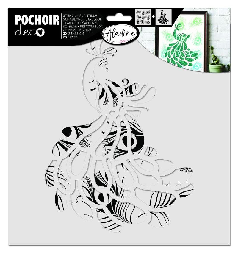Duo šablona Aladine. Balení obsahuje dvě šablony, pomocí nich vymodelujete vícevrstvý nebo plastický motiv. Šablona s pávem slouží jako podkladová. Šablona s peříčky pak dotvoří celek. Pro plastičtější efekt můžete na peříčka použít pasty, které nanesete špachtlí. Pasty mohou být základní, perleťové, diamantové, přímo na peříčku je můžete míchat a vytvářet zajímavé barevné přechody. Pokud dáváte přednost jednodušším projektům, natupujte peříčka barvou a vytvořte zajímavou metráž. Hodí se na trička, polštáře, ubrusy, závěsy. Samostatně můžet použít i motiv páva.