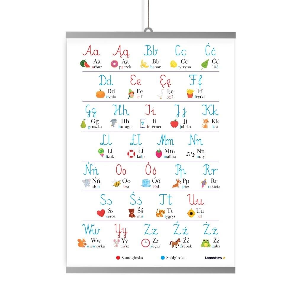 Plakat świetny do nauki alfabetu, dzięki niemu dziecko zapozna się z polskim alfabetem - literkami pisanymi oraz drukowanymi.