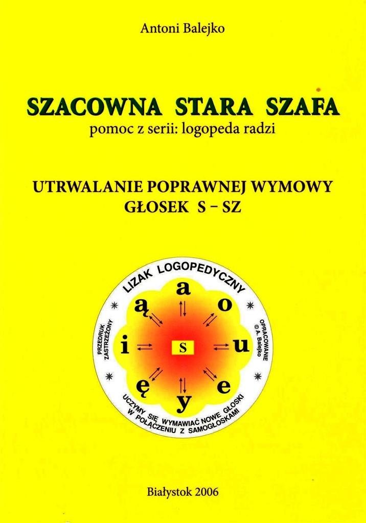 Szacowna stara szafa z serii \'Logopeda radzi\' pomaga w utrwalaniu poprawnej wymowy głosek sz-s, we wszystkich pozycjach wymawianiowych: nagłosie, śródgłośie i wygłosie. W szafie znajduje się 11 kolorowych obrazków, w nazwie których występują litery oznaczające głoskę sz, oraz 12 obrazków z literą oznaczającą głoskę s. Proponowany układ obrazków skutecznie pomaga utrwalić i różnicować wymowę głosek sz-s.