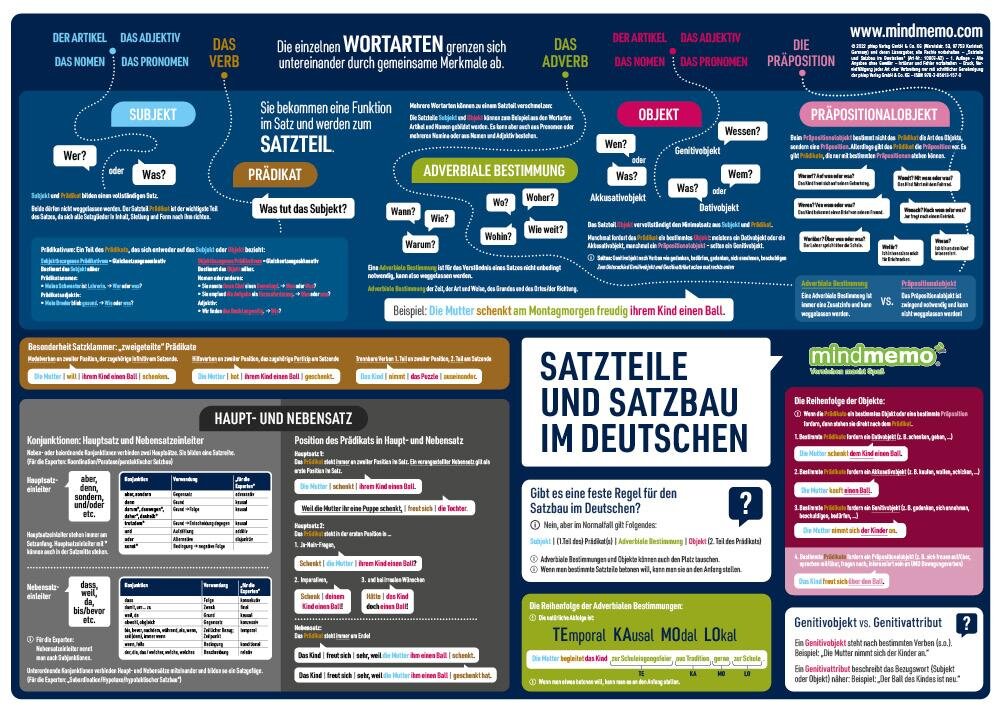 mindmemo Lernposter - Der deutsche Satzbau - Deutsch Grammatik lernen für Kinder und Erwachsene (německy)
