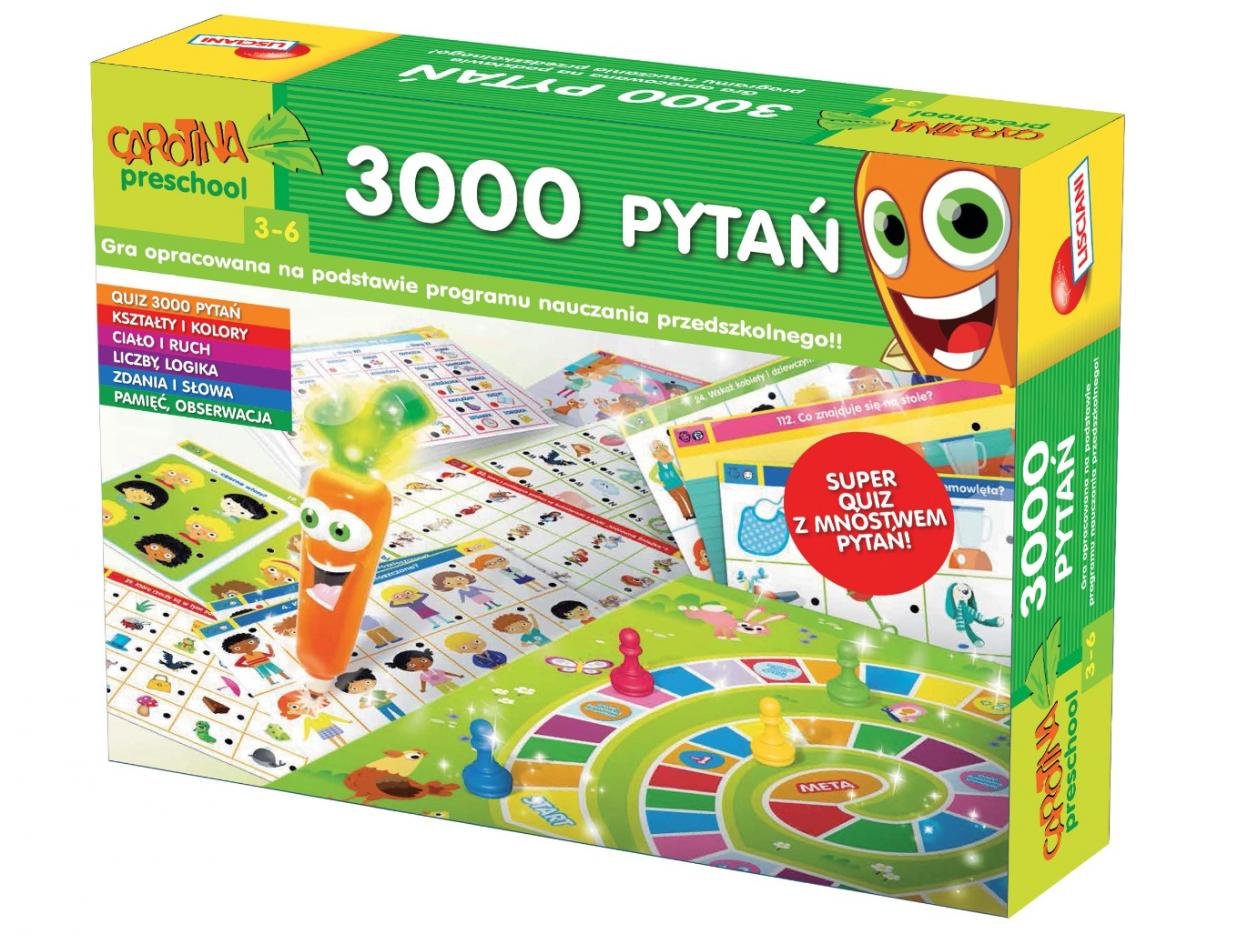 Carotina 3000 PYTAŃ to zestaw dydaktyczny oferujący mnóstwo gier i aktywności! Zawartość: plansza, 4 pionki, spinner ze strzałką oraz 63 dwustronnych, interaktywnych kart z pytaniami, na które dzieci starają się znaleźć prawidłową odpowiedź. W wyzwaniu tym pomaga im grająca i świecąca marchewka.