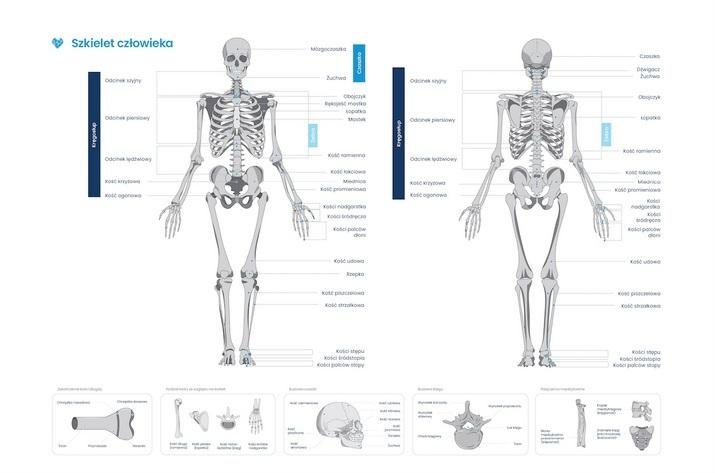 ŚWIETNA POMOC NAUKOWA Na plakacie znajdują się opisy nazw kości szkieletu człowieka, a także szczegółowy opis budowy kości, podział kości ze względu na kształt, szczegółowy opis budowy czaszki człowieka, szczegółowy opis budowy kręgu oraz rodzaje połączeń międzykostnych.