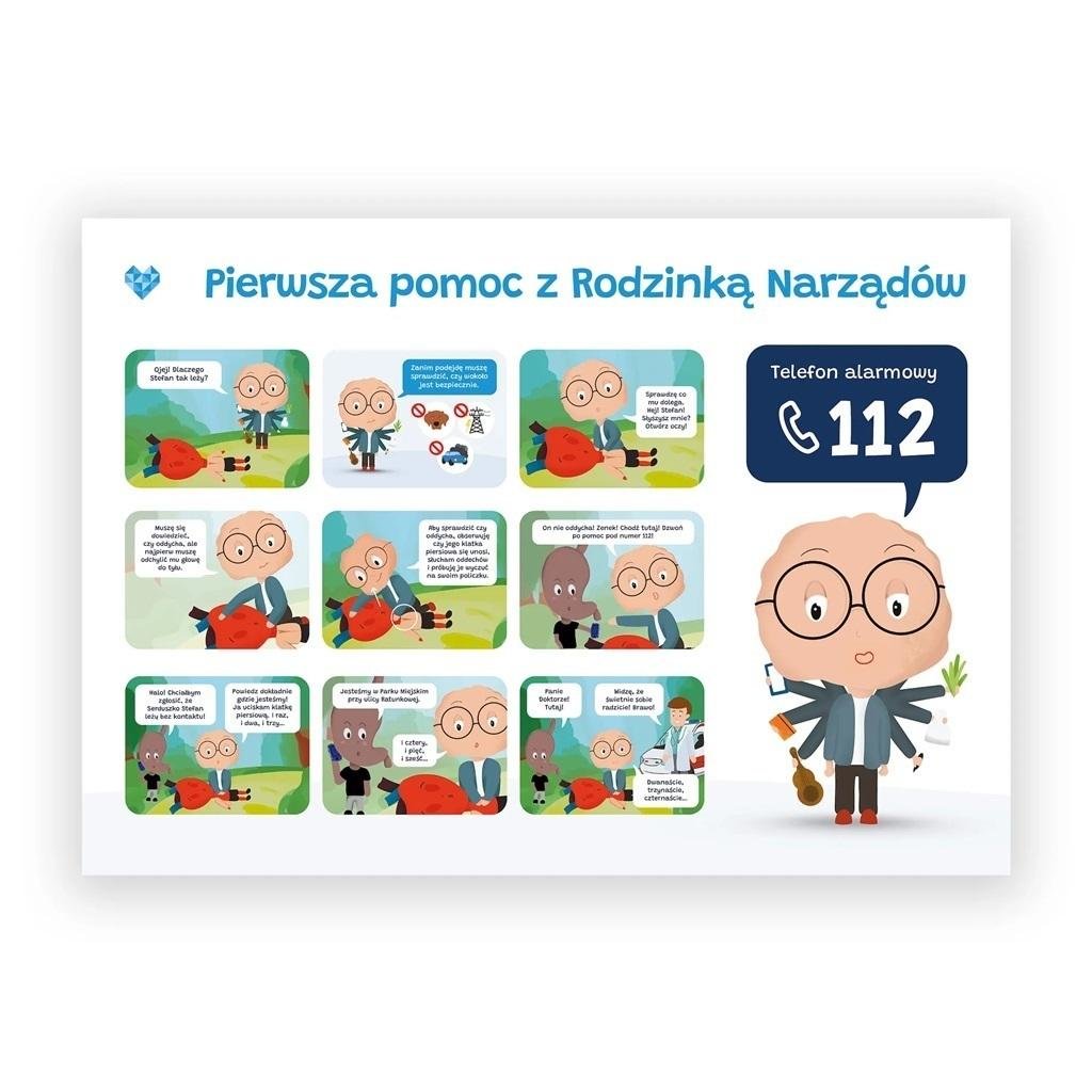 ŚWIETNA POMOC NAUKOWA Plansza przedstawia w prosty sposób najważniejsze elementy pierwszej pomocy, które powinno znać każde dziecko.