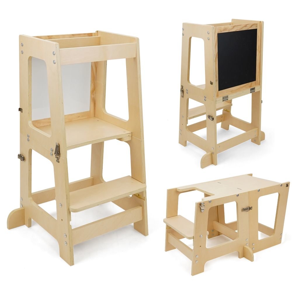 1. Věž je vyrobena z vysoce kvalitního a odolného překližkového materiálu, který se snadno sestavuje. Maximální nosnost do 50 kg. Velikost produktu: - Verze věž: 42 (Š) x 42,5 (H) x 87 (V) cm - Verze stolu a židle - 78 (Š) x 42,5 (H) x 43,5 (V) cm 2. K dispozici jsou 2 stupně nastavení výšky (16,5 & 22,5 cm -měřte od podlahy), aby vyhovovaly dítěti od malých až po vyšší. 3. Prodloužené nohy pro vyšší stabilitu věže. 4. Oboustranná psací tabule je součástí balení: křídová tabule a magnetická tabule. 5. Vhodné pro děti ve věku 18-36 měsíců.
