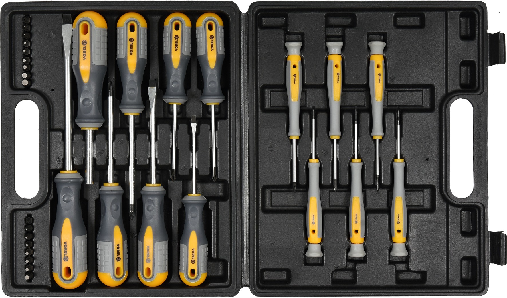Sada 18ks šroubováků vyrobených z CrV6150 oceli s ergonomicky tvarovanými rukojeťmi z protikluzného PP a TPR.
