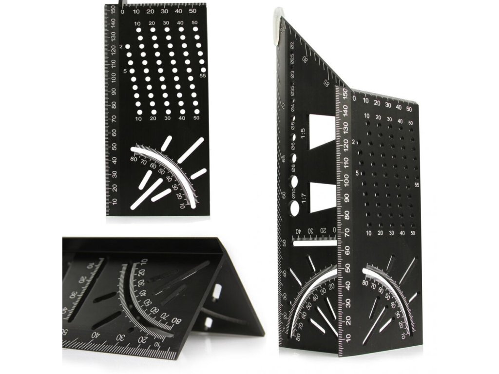 Víceúčelový trojrozměrný japonský hliníkový úhelník ideální pro měření a určování úhlů na všech površích. Umožňuje pracovat s 3D materiály, jako jsou dřevěné trámy, trubky apod.