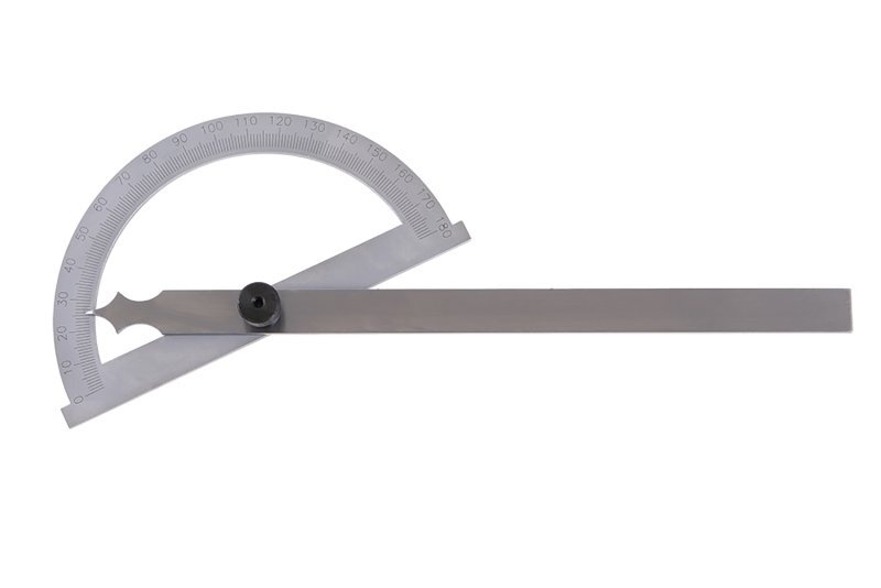 Úhloměr s otočným ramenem, délka základny úhelníku 150mm, délka otočného ramene 200mm, 0 - 180°, možnost aretace naměřeného úhlu pro přenesení. Nerezová ocel, koženkové pouzdro.