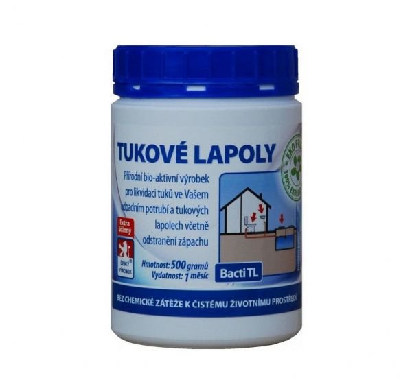 BioBak Bakterie do lapolů - přírodní bakteriální výrobek pro likvidaci tuků ve Vašem odpadním potrubí a tukových lapolech včetně odstranění zápachu - Extra účinný. Jedná se o směs bakterií a enzymů určených pro rozklad tuků v odpadním systému a sifonu. Výrobek rozkládá tuk, tukové usazeniny a udržuje správnou činnosti tukového lapolu. Pravidelným používáním se zabrání srážení tuků na vnitřních stranách odpadních trubek, tvrdnutí tuků a ucpání odpadních systémů.Zabraňuje případnému novému usazování rostlinných či živočišných tukových sloučenin. Bakteriální výrobek BioBak Lapol zcela eliminuje typický štiplavý zápach z rozkládajících se tuků. Výhody? + snižuje náklady na odvoz a likvidaci tukového odpadu + nedochází k ucpání odpadů a tukových lapolů + odstraňuje zápach + zamezuje tvorbě tukových usazenin + tukové lapoly jsou funkční