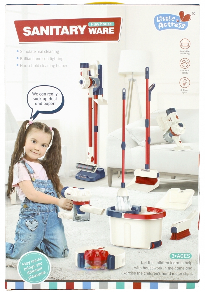 Zalety produktu: rozwija wyobraźnię, ćwiczy precyzję ruchową, uczy naśladowania czynności wykonywanych przez dorosłych, uczy dbania o porządek, odkurzacz oraz robot sprzątający posiadają funkcje dźwiękowe oraz świetlne, odkurzacz po uruchomieniu wciąga drobne śmieci. Zestaw do sprzątania, który nauczy dzieci dbania o porządek, świetnie się przy tym bawiąc. Zawartość zestawu: odkurzacz, robot sprzątający, mop z wiadrem, szufelka z miotłą, szufelka ze zmiotką wszystko to imitacja prawdziwych produktów do sprzątania . Całość wykonana z plastiku i materiału. Wymiary/waga/baterie: wymiary produktu dł. x wys. x gł. cm : wiaderko-24x16x18, miotła dł. : 68 cm, mop-79 cm, odkurzacz- 91 cm, robot sprzątający- 17x5x18, wymiar opakowania dł. x wys. x gł. cm : 30x45x20, waga produktu bez opakowania kg : wiadro z mopem 0,48 kg, robot sprzątający 0,30 kg, miotła z szufelką 0,24 kg, odkurzacz 0,90 kg, zmiotka z szufelką 0,11 kg waga produktu w opakowaniu kg : 2,40 kg, wymaga zasilania bateriami odkurzacz-5 x AALR06- nie załączono do zestawu, robot- 3 x AALR06- nie załączono do zestawu. Zestaw przeznaczony dla dzieci w wieku: 3 . Pakowany w karton. W kartonie zbiorczym po 6 szt.