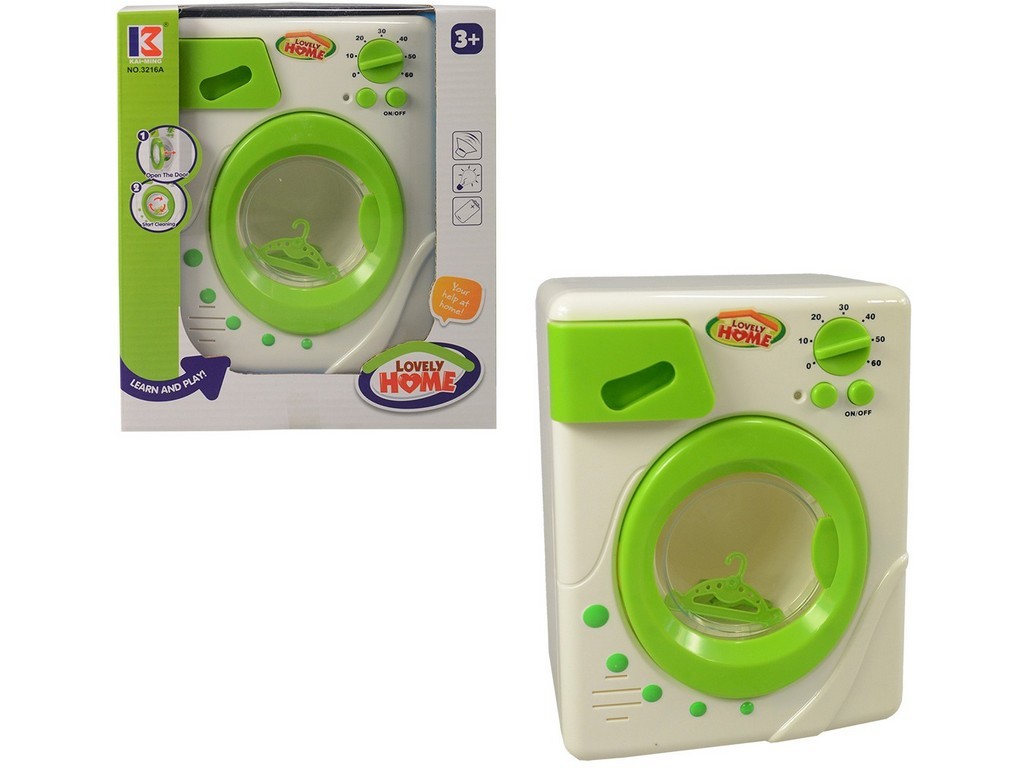 Pračka na baterie (3x1,5V AA). Pračka se světlem a zvukem, lze otevřít dvířka, s efektem praní. Materiál: plast. Vhodné pro 3+.