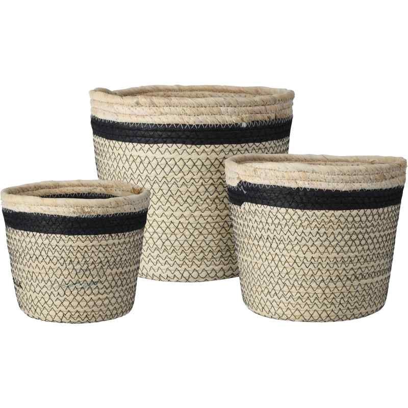 BASKET,CORN LEAF, NATURAL WITH BLACK STRIPE SET OF 3, SIZES: SMALL: 17X15CM, MEDIUM: 20X18CM, LARGE: 23X21CM, EACH PIECE WITH HANGTAG AND UNIQUE BARCODE/ BASKET SMALL(8720573 482202), HEIGHT150XDIA170MM, Hangtag (HT21)/ BASKET MEDIUM(8720573 482219), 230X230X190MM, Hangtag (HT21)/ BASKET LARGE(8720573 482226), 250X250X220MM, Hangtag (HT21) / CFT 3,30,(5.488/40ft HQ)