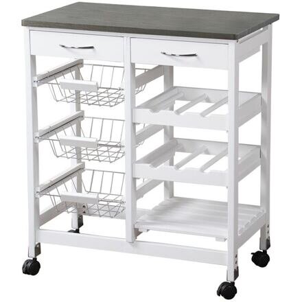 Vyrobený z kvalitní dřevovláknité desky v elegantní bílé barvě, tento vozík nabízí stabilní a odolnou konstrukci. Je vybaven třemi drátěnými koši speciálně určenými na uskladnění zeleniny, dvěma zásuvkami pro uložení kuchyňských potřeb a dvěma přihrádkami na láhve, které vám pomohou udržet pořádek a vše máte po ruce. Výhodou je také odnímatelný servírovací podnos, který lze snadno využít při servírování jídel či nápojů.