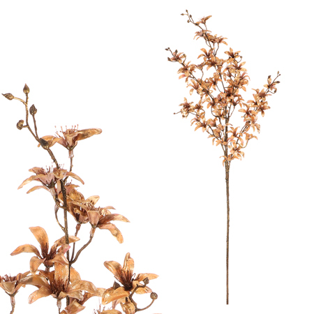Oživte svůj sváteční prostor nezapomenutelnou atmosférou romantiky a elegance s touto umělou větví plnou drobných kvítků s pozlacením. Nádherný zlatý dekor s jemnými pozlacenými detaily, přinášejí do vašeho interiéru nádech luxusu a noblesy. Umělá květina zaručuje dlouhotrvající krásu a může být skvělým doplňkem na vašem stole, komodě nebo jiném viditelném místě. Užijte si dotek elegance a přenesení do pohádkového světa s touto úchvatnou rostlinnou dekorací.