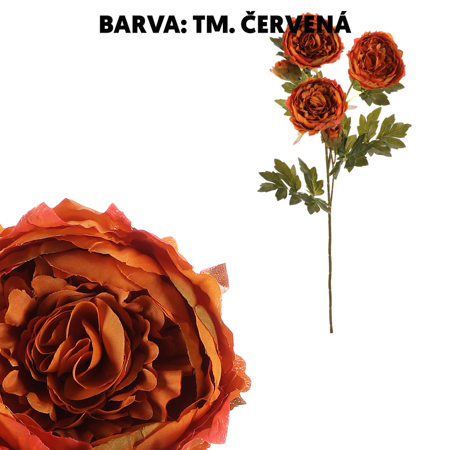 Umělá řezaná pivoňka s bohatými tmavě červenými květy a jemnými poupaty vypadá jako právě natrhaná ze zahrady. Realisticky zpracovaný stonek s lístky dodává rostlince přirozený vzhled, díky kterému krásně vynikne samostatně ve váze, ale může být součástí i větších květinových kompozic. Nadčasová dekorace, která si uchová svou krásu napořád a vnese do interiéru i venkovních prostor nádech romantiky.