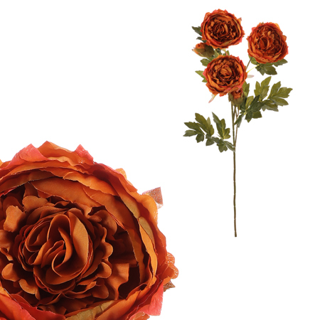 Umělá řezaná pivoňka s bohatými oranžovými květy a jemnými poupaty vypadá jako právě natrhaná ze zahrady. Realisticky zpracovaný stonek s lístky dodává rostlince přirozený vzhled, díky kterému krásně vynikne samostatně ve váze, ale může být součástí i větších květinových kompozic. Nadčasová dekorace, která si uchová svou krásu napořád a vnese do interiéru i venkovních prostor nádech romantiky.