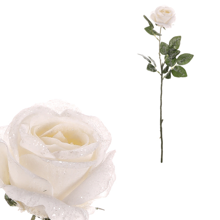 Umělá řezaná růže s bílou barvou květu a jemným ojíněním působí, jako by ji právě pokryla ranní námraza. Věrně napodobuje živou květinu a přináší do interiéru zimní eleganci. Skvělá volba pro vánoční dekorace i nejrůznější slavnostní události.