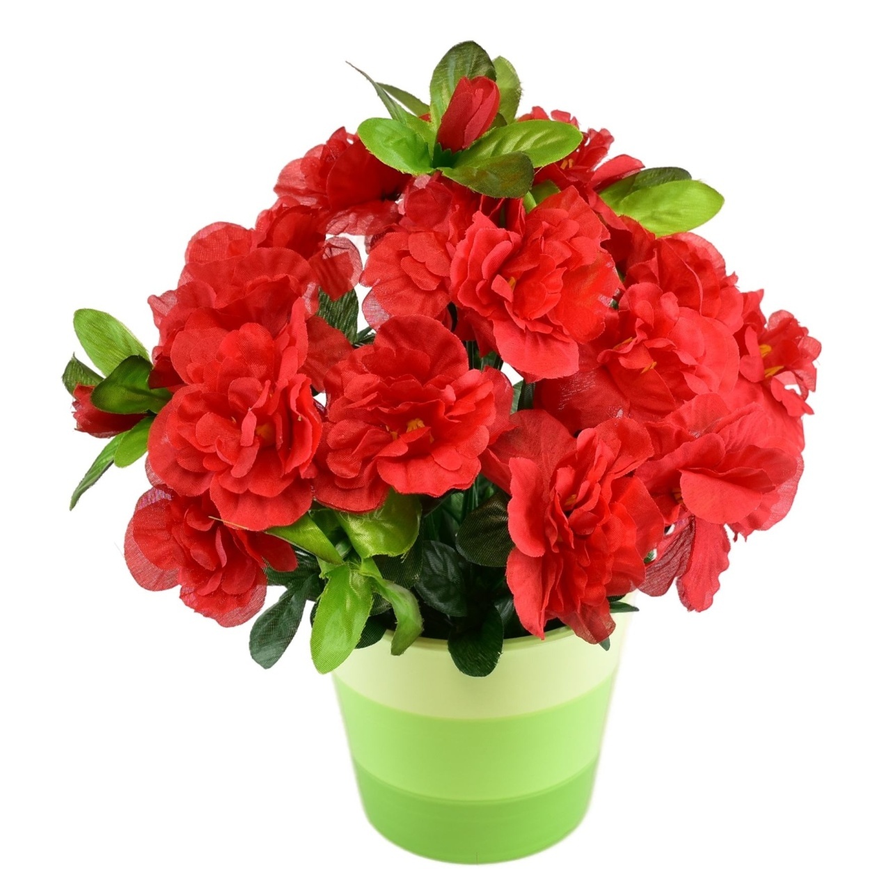 Umělá květina Azalka s červenými květy ve světle zeleném keramickém květináči dodá vašemu domovu eleganci a jemnost. Tento stylový vývazek z 18 květů azalek v červené barvě je vyroben z kvalitních materiálů, jako je plast, kov a textil, což zajišťuje jeho trvanlivost a odolnost. Kombinace se světle zeleným keramickým květináčem (výška 10,5 cm x průměr 12,5 cm) nejen opticky zvýrazní květinu, ale také vytvoří luxusní a působivý design.