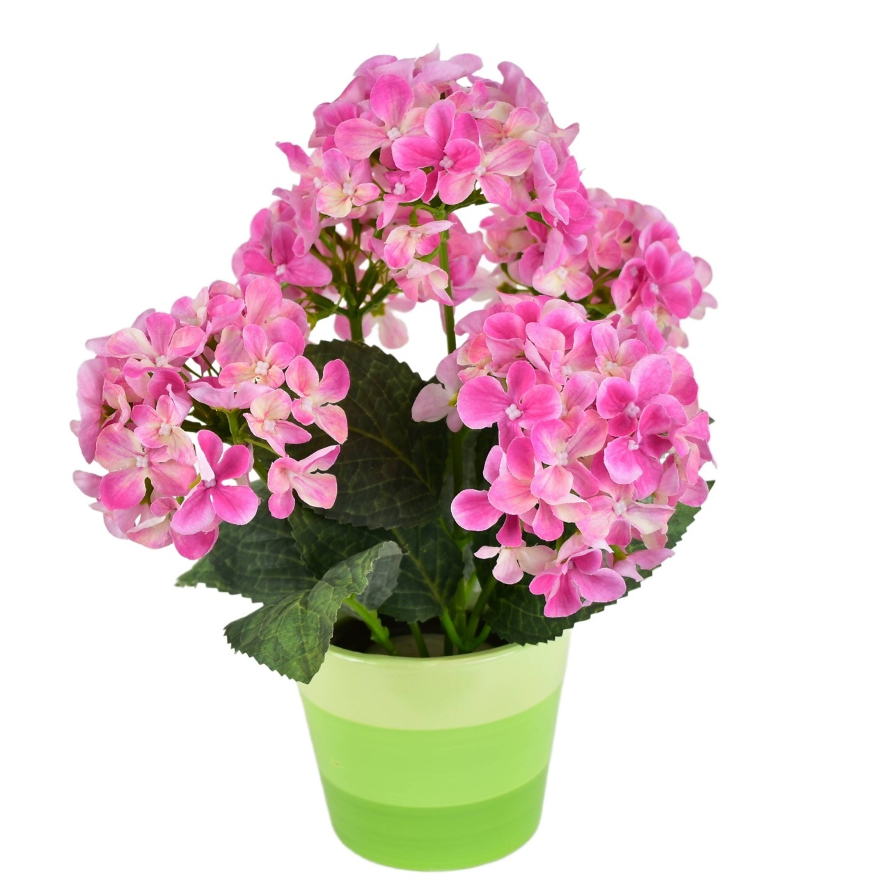 Hortenzie růžová s 5 květy je elegantním doplňkem pro váš domov. Tento nádherný květinový aranžmá je pečlivě umístěn v keramickém květináči o velikosti 33x27 cm, který vyniká svou zelenou barvou. S realistickým vzhledem výrobku můžete snadno obohatit jakýkoliv prostor. Ideální pro parapety či balkóny, díky stabilnímu základu ze sádry, který zajišťuje dokonalou oporu.