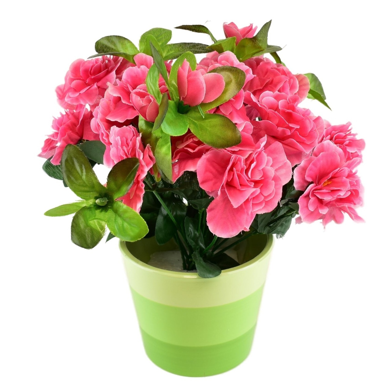 Umělá květina Azalka s růžovými květy v světle zeleném keramickém květináči dodá vašemu domovu eleganci a jemnost. Tento stylový vývazek z 18 květů azalek v růžové barvě je vyroben z kvalitních materiálů, jako je plast, kov a textil, což zajišťuje jeho trvanlivost a odolnost. Kombinace se světle zeleným keramickým květináčem (výška 10,5 cm x průměr 12,5 cm) nejen opticky zvýrazní květinu, ale také vytvoří luxusní a působivý design.