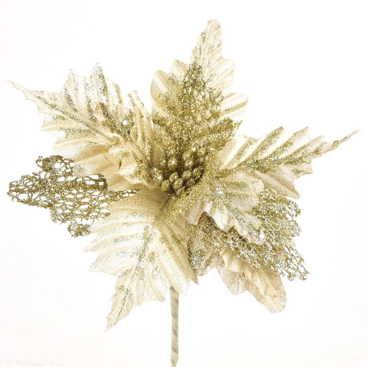 Poinsetie třpytivá zápich - šampaň - dokonalý doplněk pro vaši vánoční výzdobu! Tento nádherný Poinsetie s krásnou šampaňovou barvou a třpytivým povrchem rozzáří každou místnost svým kouzlem.