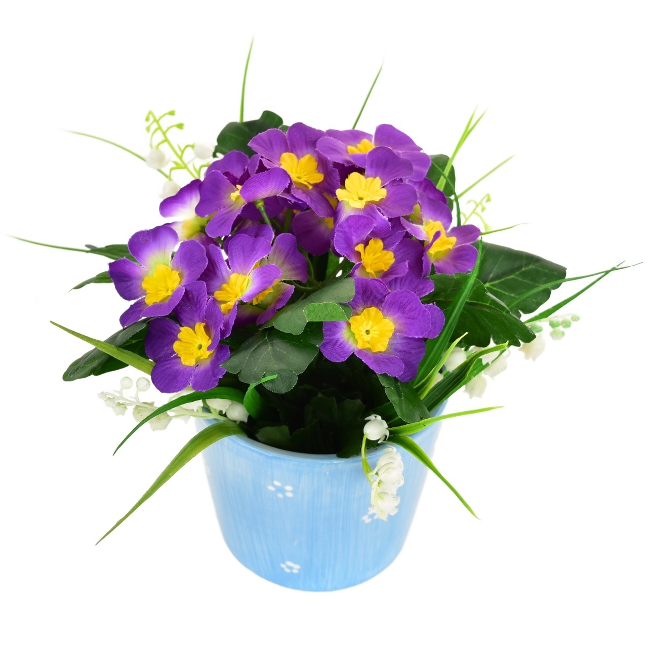 Obohaťte svůj domov o nádech elegance s naší umělou květinou Primule s okouzlujícími fialovými květy. Umístěná ve stylovém světle modrém keramickém květináči dodá vašemu interiéru jemnost a půvab. Tento jedinečný vývazek, skládající se z 12 květů krokusů, vyniká nejen svou krása, ale také kvalitou použitých materiálů, mezi které patří plast, kov a textil. To zajišťuje trvanlivost a odolnost produktu.