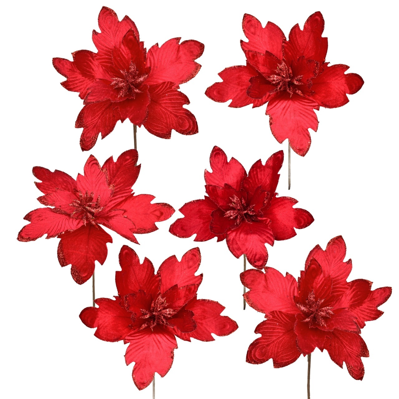 Poinsetie květ zápich textilní třpytivá červená Ø30 cm, 6 ks