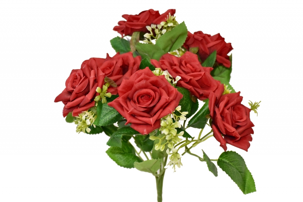 Kytice umělých růží s listy a zelení. V kytici je 7 květů růží.