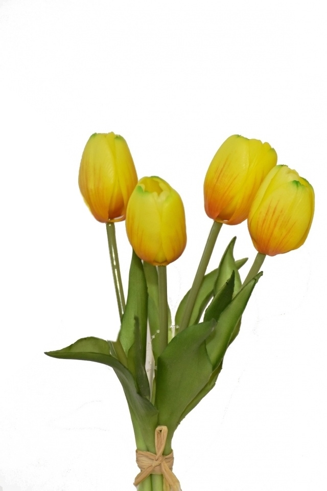 Krásná kytička 4 umělých tulipánů. Všechny tulipány vypadají jako živé, jsou vyrobené z gumy (latexu). Na listech i květech je vidět žilkování.