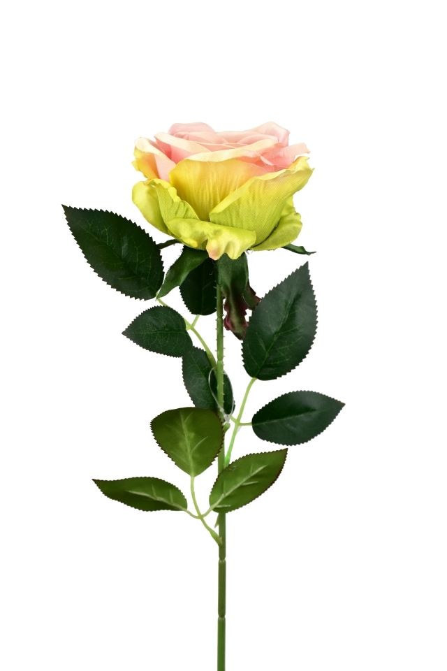 Umělá velkokvětá růže s listy.