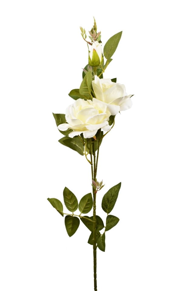 Umělá růže má 2 květy, 1 vybarvené poupě a 3 zelená plastová poupátka.