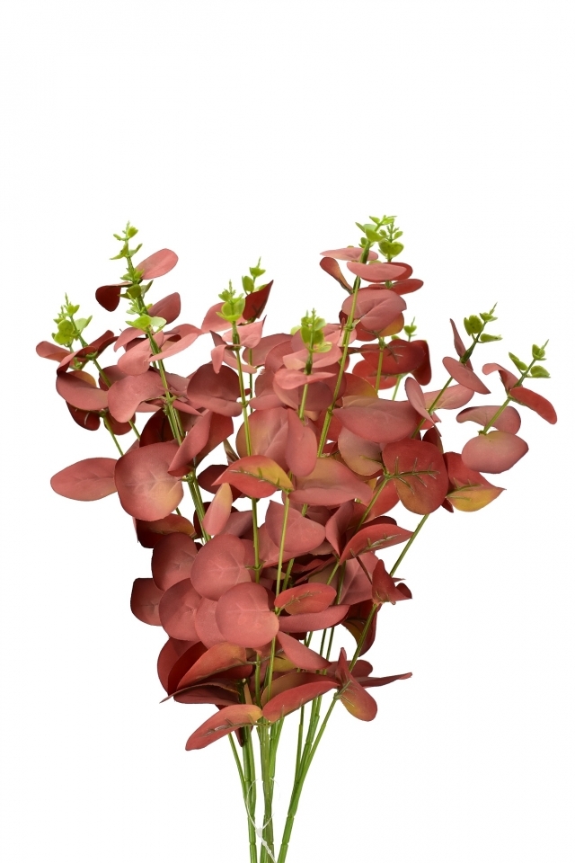 Umělá kytice eukalyptu. V kytici jsou 4 výhony, na každém výhonu jsou 4 větvičky s listy.