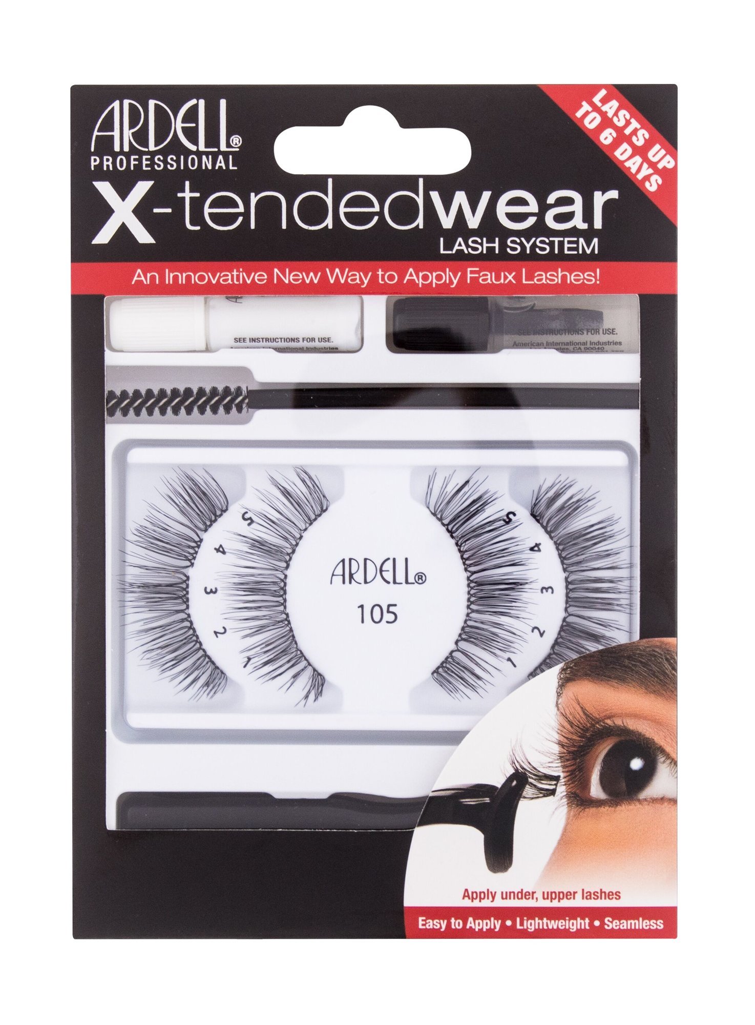 Ardell X-Tended Wear umělé řasy X-Tended 105 1 ks + lepidlo na řasy X-Tended Wear 1 g + aplikátor 1 ks + odstraňovač řas 1 g + kartáček na řasy 1 ks