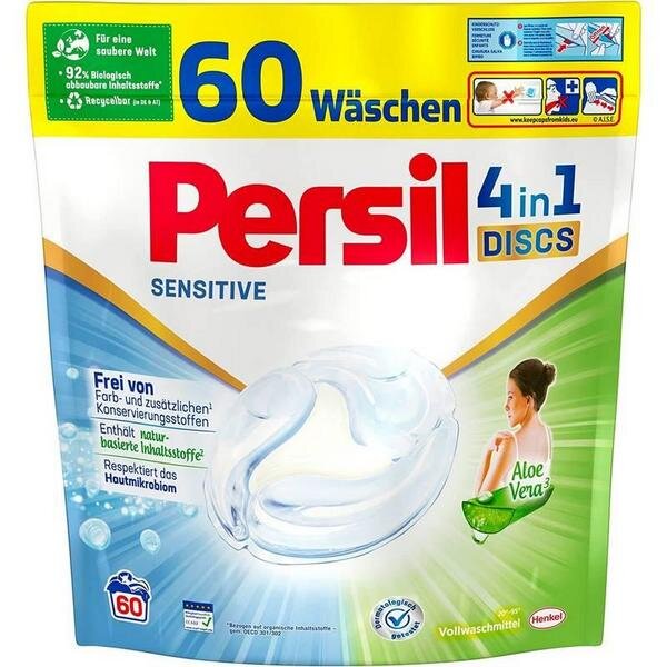 Persil Discs 4in1 60ks Sensitive Aloe Vera jsou jednoduše použitelné kapsle na praní, které nabízejí silné čištění, dlouhotrvající svěžest a šetrnost k citlivé pokožce. Díky účinnosti při nízkých teplotách a recyklovatelnému obalu jde o praktické a promyšlené řešení pro moderní domácnost.
