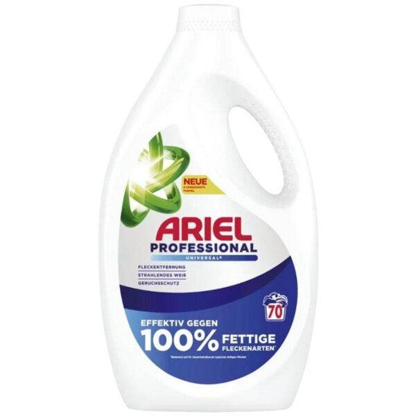Ariel Professional gel 3,15 L Universal+ je vysoce koncentrovaný prací gel navržený pro efektivní praní v domácnostech i menších provozech. Díky své univerzální receptuře je vhodný pro bílé i stálobarevné prádlo a zajišťuje odstranění skvrn již při prvním praní, i při nižších teplotách od 20 °C.