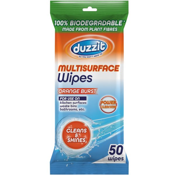 Duzzit univerzální vlhčené ubrousky z organického plně rozložitelného materiálu - 50ks skvělé univerzální ubrousky, které jsou vhodné pro dokonalý a rychlý úklid povrchů jako je kuchyňská pracovní deska, jídelní stůl, umyvadlo, koupelna a to včetně toalety apod... Ubrousky jsou napuštěné speciálním univerzálním čistícím přípravkem, který dokáže odstranit běžný nános mastnoty i vodního kamene nebo nečistot. Ubrousky jsou vyrobeny bez plastů a jsou plně kompostovatelné a biologicky odbouratratelné. Ubrousky mají jemnou a příjemnou vůni pomerančů. Balení vlhčených univerzálních ubrousků Duzzit je uzavíratelné a tak brání vysychání.