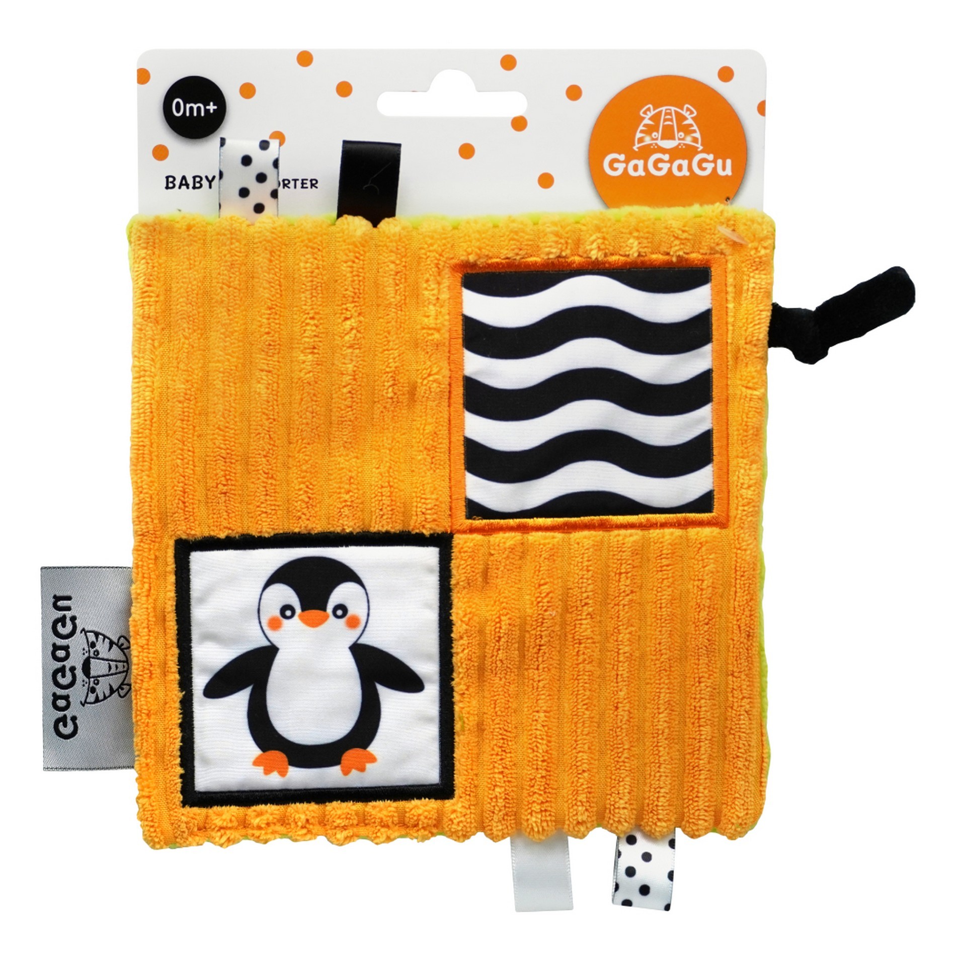 Dečka má kontrastní barvy a vzory, což stimuluje zrak dítěte a šustivý materiál uvnitř hračky stimuluje jeho sluch. Dítě má možnost poznávat různé textury, díky kterým si rozvíjí hmat. Doplňkové stuhy, plyšová poutka, velký štítek - usnadňují dítěti uchopení hračky a podporují tzv. cvičení jemné motorické dovednosti (pohyby prstů a rukou). Dečka je oboustranná - na každé straně má jinou grafiku: na jedné straně tučňák - na druhé mýval. Hračka je velmi lehká a šikovná, snadno skladná, ideální na procházku nebo výlet. Je určena pro děti ve věku 0m + a je jedním z 12 produktů dostupných pod značkou GaGaGu. Kromě dečky jsou to i chrastítka, spirála, přívěsky, knížky, smyslové kostky a smyslová podložka. Informace o prodktu (v bodech): • kontrastní barvy a vzory - stimulují zrak dítěte • různé textury materiálu - stimulace hmatu • šustivý materiál - rozvoj sluchu • různé prvky (stuhy, poutka, štítek) - podpora jemné motoriky (pohyby prstů a rukou) • lehká a šikovná hračka - na procházku, domů nebo na cesty • žádné plastové díly • lze kombinovat s dalšími produkty GaGaGu