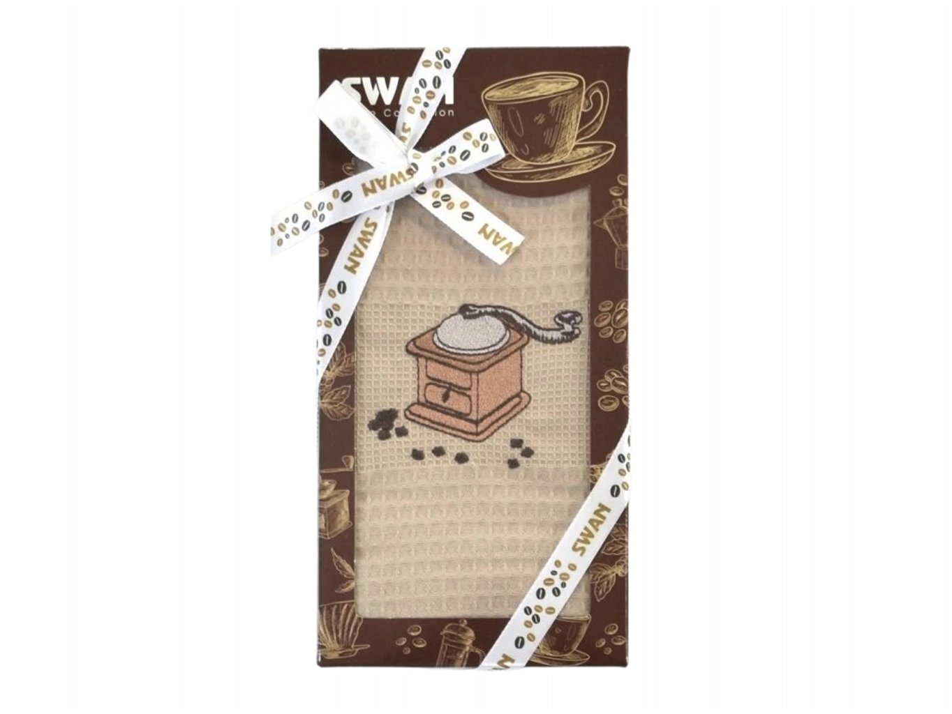 Elegantní kuchyňská utěrka v hnědé barvě s výšivkou mlýnku na kávu. Dodává se v dárkovém balení s dekorativní stuhou - ideální dárek pro milovníky kávy a stylového stolování.