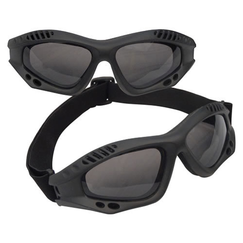 Taktické brýle s lehkým polstrovaným rámem a s kouřovými polykarbonátovými skly s UV ochranou UV 400 a ochranou proti poškrábání a mlžení.