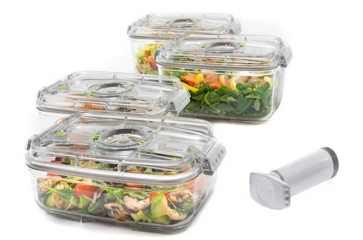 Obsah balení: 4 boxy: 0.5 L, 0.8 L, 1.4 L, 2 L, ruční vakuova pumpa Materiál: TRITAN - je vysoce kvalitní materiál bez BPA, který vydrží celé generace. Je zdravotně nezávadný, mimořádně odolný proti nárazu, neabsorbující barvu ani aroma skladovaných potravin. Ventily boxů jsou vyrobeny ze silikonu. Ostatní části jsou z ABS plastu, který zajišťuje pevnost materiálu. Boxy jsou vhodné do mikrovlnky, ledničky, mrazicího boxu a myčky