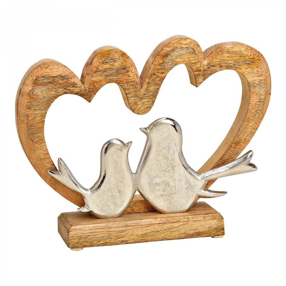 Okouzlující hliníkové srdce s ptáčky na dřevěném stojanu
