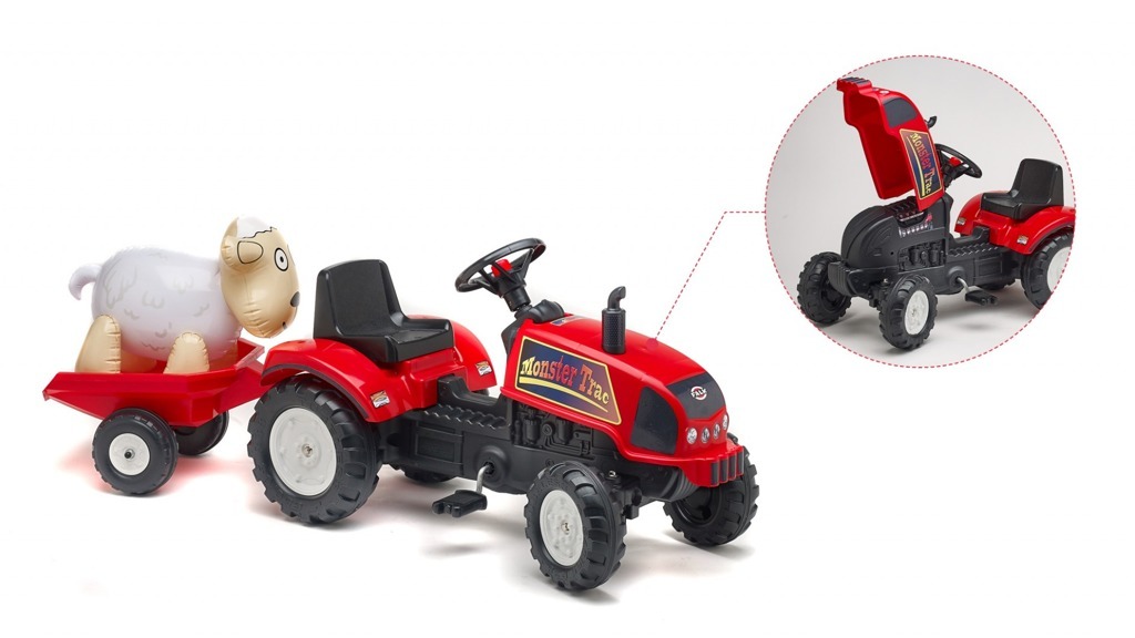 Traktor Trac s valníkem a otevírací kapatou červený. Součástí traktoru je klakson, přívěs,otvírací kapota motoru a nafukovací ovečka. Z vysoce odolného a kvalitního plastu. Velikost 132×42×52,5cm Věk 2+. Všechny traktory Falk jsou testovány na 30kg - dle požadavků evropských norem. Vyrobeno ve...