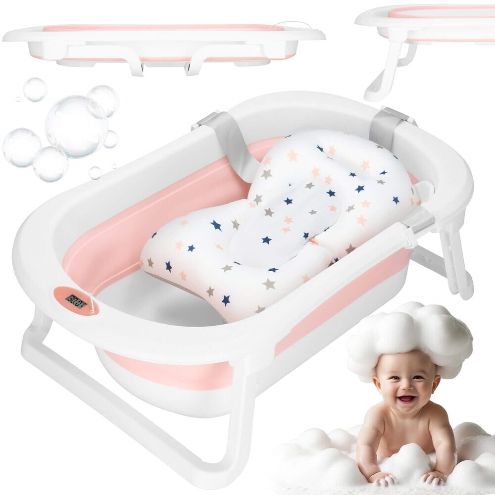 Skládací vanička na koupání s teploměrem a ergonomickou podložkou zajistí pohodlné a bezpečné koupání miminka. Vanička pro novorozence má zabudovaný LCD teploměr s přesností 0,1 °C a teplotní čidlo s dlouhým kabelem. Odtok se zátkou mění barvu podle teploty vody. Měkký polštář s polystyrenovou výplní se přizpůsobí dětskému tělu a upevňovací popruhy jej pevně drží. Lehká dětská vanička se snadno skládá, má protiskluzový stojan a je ideální na cesty i do malých koupelen.