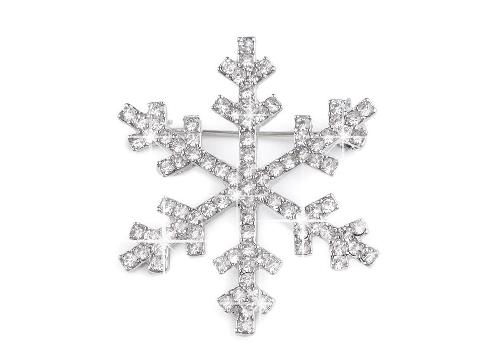 Třpytivá brož s vločkou je osázená broušenými kamínky. Na zadní straně má brožový špendlík, na kterém je pojistka proti nechtěnému otevření. Brož můžete nosit na oděvech, kloboucích, taškách či s ní můžete sepnout šátek.