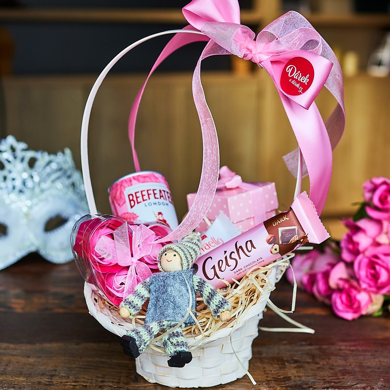Bílý košíček s uchemGin&Tonic Beefeater 0,25, pinkSrdce s mýdlovými květinamiSkřítekKrabička s puntíky a mašlíPralinky RaffaelloČokoládová tyčinka GeishaVše s nádhernou mašlí, v celofánu