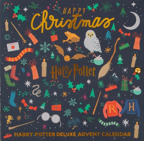 Adventní kalendář Harry Potter Deluxe. Rozměry: 27 x 26 x 10 cm. Kalendář obsahuje 24 předmětů, například: postava z HP (Gomee), ponožky, záložka, ozdoby na stromeček, klíčenka, pero a další...