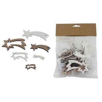 Sada dekoračních vánočních komet.Sada obsahuje 18 komet o třech velikostech.Rozměry : 3 - 7,7 x 0,5 cm, výška 0,7 - 3,2 cm.Barva : kombinace hnědá, bílá.Materiál na bázi dřeva.