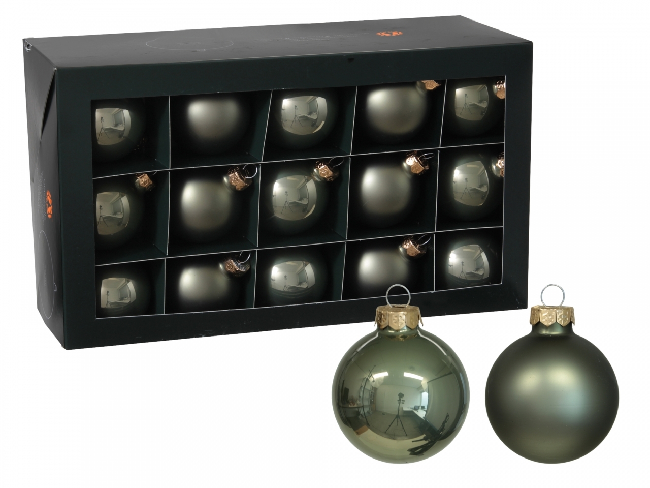 Sada 30 ks skleněných baněk v barvě granite green. V sadě jsou matné a lesklé baňky.