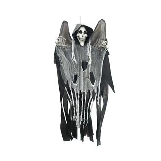 Halloweenská dekorace - anděl smrti.Dekorace obsahuje 3 AA baterie.Dekorace obsahuje čidlo na pohyb, reaguje na silný zvuk.Efekty : pohyb, světlo, strašidelný zvuk.Rozměry : 85 × 12 cm, výška 120 cm.Barva : kombinace černá, šedá.Materiál : textil, plast.