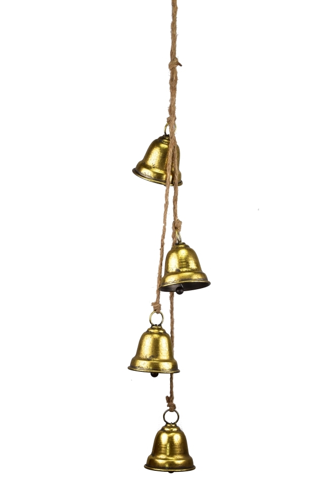 Čtyři zlaté kovové zvonky na jutovém provaze 9x7,7x75 cm